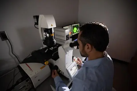 Analysis of materials is enabled by mass spectrometry (Bruker Microflex MALDI-TOF, Bruker maXis Impact EIS, Varian Saturn GC-MS, Varian 1200 LC-MS), ion chromatography (Dionex DX-100), and dynamic light scattering (Malvern NanoZetasizer). Electron microscopy includes Ziess Supra 40VP SEM, JEOL JSM-6480LV SEM, and JEOL JEM 1200-EXII TEM. Force and probe microscopy using Agilent AFM 5400 AFM/SPM, Agilent 5500 ILM AFM/SPM on an inverted light microscope, Asylum MFP-3D-BIO SPM with simultaneous scanning probe and optical microscopy, and Asylum MFP-3D are supported by in-house cantilever design capabilities. Light (Leitz Aristoplan Variophot, Zeiss Discovery V8 stereo microscope, Zeiss Axio Scope, Keyence VHX-2000 digital microscope, Leica DMIRE2 spinning disk confocal microscope) and fluorescence microscopy (Leica TCS SPE II confocal microscope, Zeiss Axiophot) facilities are enhanced by specialized capabilities in Raman (Xplora Horiba Raman Spectroscope with three laser lines) and Brillouin scattering spectrometry, as well as optical holography.